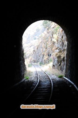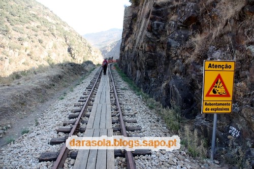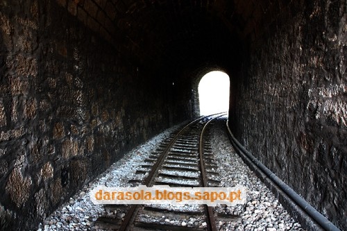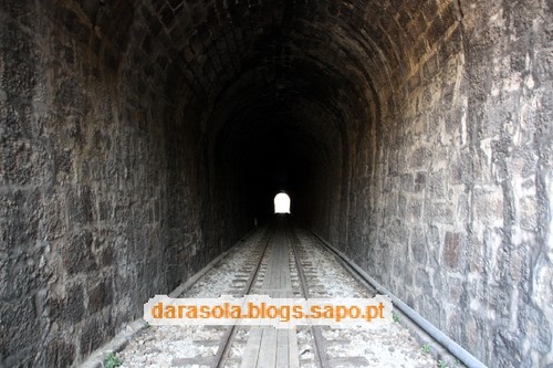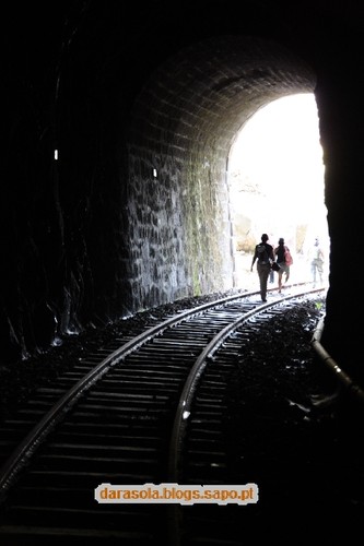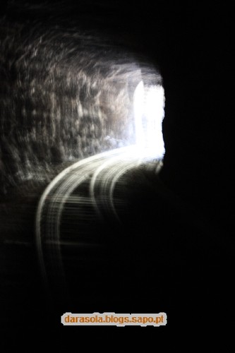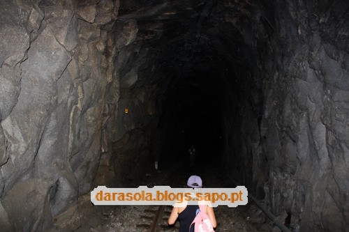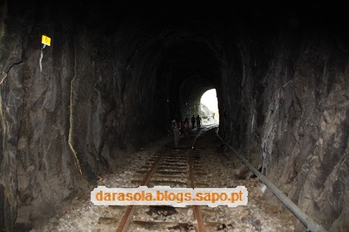 Dentro do túnel das presas. Colocaram umas tábuas que facilitam o percurso pela linha nesta zona. Se assim fosse ao longo da linha, a tarefa seria muito mais fácil, mas não teria a mesma piada. No fim do túnel, voltámos para trás.