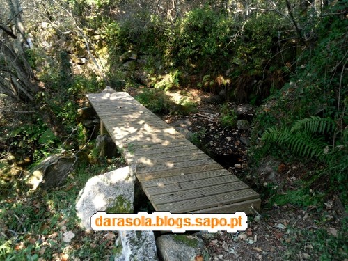 Uma pequena ponte sobre uma linha de água. Quase não corria água, mas a sombra e a humidade foram agradáveis para aplacar o intenso calor do dia.