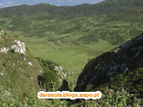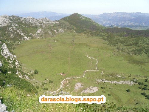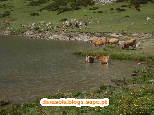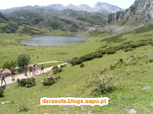 Considerado um dos locais a não perder para quem visita os Picos da Europa, o planalto dos lagos La Ercina e Enol (ou lagos de Covadonga, como também são conhecidos) possui uma paisagem muito agradável, com a particularidade de estarmos lado a lado com milhares de ... vacas! O acesso ao planalto é proibido ao trânsito em veículo próprio e limitado a autocarros que serpenteiam serra acima, passando a milímetros dos muros da estreita estrada de acesso e desviando-se de vacas que por ali decidiram pastar. Ali não há dúvidas, o gado bovino é rei! Ao longo da subida as vistas são fabulosas e os precipícios assustadores. Depois da viagem entre Cangas de Ónis e o planalto, somos "largados" perto do centro de acolhimento aos visitantes onde podemos visitar gratuitamente uma exposição interativa sobre a fauna, flora, geografia e geologia dos Picos. Noutro edifício mais adiante podemos observar uma maqueta em tamanho gigante daquele que é o 1º parque nacional espanhol, com uma apresentação em vídeo sobre os aspetos essenciais. Pode-se dizer que os espanhóis sabem receber os turistas! Quanto à caminhada propriamente dita, o percurso leva-nos de seguida às antigas minas de Buferrera, onde pudemos observar os aspetos geológicos relevantes bem como os métodos de trabalho da altura. Depois, chegamos ao lago Ercina, o primeiros dos dois lagos de montanha que caraterizam este planalto. Pelo caminho observamos ainda o miradouro do Príncipe das Asturias, de onde víamos o Polje de Colmeya, um fenómeno semelhante ao que temos na Serra de Aire e Candeeiros. Depois de fotografar as vaquinhas e o 1º lago, seguimos o percurso até ao miradouro de entrelagos, de onde tínhamos uma bela vistas sobre os dois lagos. O PR na sua versão mais curta segue então em direção ao lago Enol, no entanto optámos pela versão mais longa e acabámos por circundar o monte de calcário que os separa. A caminhada é muito agradável e levou-nos à descoberta de vários refúgios de pastores que ali permanecem durante o verão junto das cabeças de gado que ali pastam livremente. Seguindo para Vega de Enol, o PR conduziu-nos a um bosques fantástico, onde a vegetação se mistura com as formações rochosas, criando cenários curiosos onde não se percebia muito bem onde acabava a rocha e começava o tronco das árvores. Após a travessia de outra zona descampada de pastagens, alcançamos finalmente as margens do lago Enol. Contornamo-lo e regressámos então ao estacionamento dos autocarros onde esperamos pouco tempo até apanharmos o veículo que nos levaria ao Santuário de Covadonga, um local carregado de histórias e lendas, ligado ao rei Pelaio (o 1º rei de Espanha) que deu início à reconquista cristã da Península Ibérica. A Cueva santa com a sua capelinha, os túmulos e a queda de água (que infelizmente estava praticamente seca na altura), bem como a catedral de mármore vermelho valem sem dúvida uma paragem obrigatória na descida do planalto.