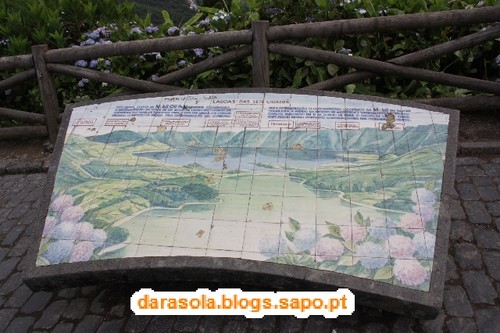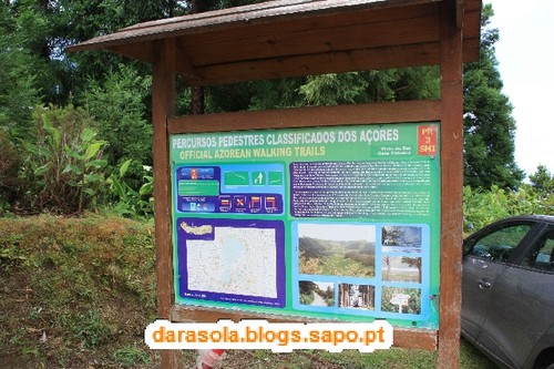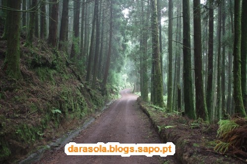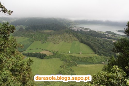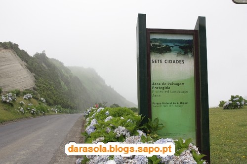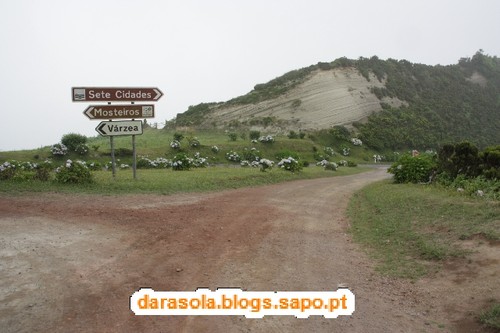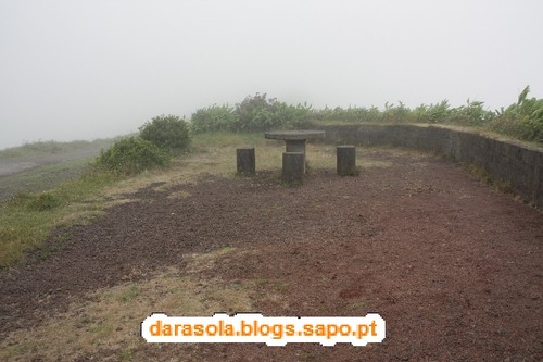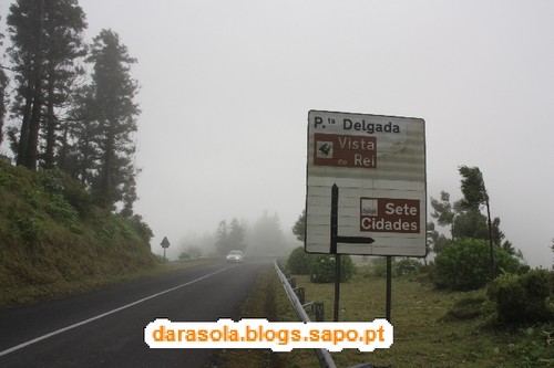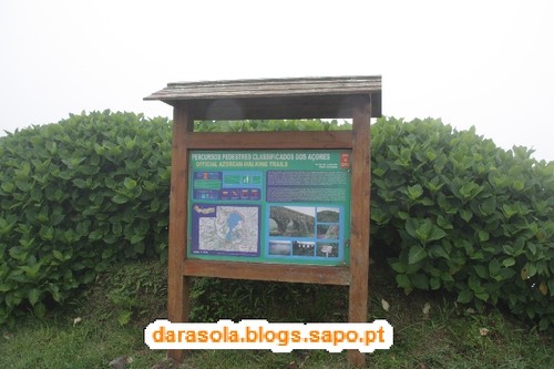 Esta caminhada foi delineada com base numa sugestão da revista itinerante, na sua edição das maravilhas naturais de Portugal, que falava numa rota de miradouros em redor da lagoa das sete cidades. O percurso é tecnicamente muito simples, pois basta circundar as lagoas pelos caminhos da cumeada. O "esqueleto" deste trajeto assenta em dois percursos pedestres locais: o PR3SMI (Vista do Rei - Sete Cidades) e o PR4SMI (Mata do Canário - Sete Cidades) mas é necessário efetuar uma ligação por estrada entre o início de um e o final do outro. O dia começou muito bonito, mas à medida que nos deslocávamos até à zona da cratera, a nebulosidade ia aumentando, o que não agourava nada de bom. Acabamos por iniciar o percurso junto ao famoso miradouro do rei. Ficamos impressionados pela negativa com a quantidade de carros no local e sua falta de ordenamento (é um salve-se quem puder para estacionar), mas mais ainda com o enorme mamarracho do hotel abandonado ali ao lado. Não se percebe como puderam construir um edifício daquele tamanho num local tão especial como este. O seu aspeto abandonado são um cancro para a beleza do local e não se percebe como não foi ainda demolido. Depois dos registos fotográficos da praxe iniciámos o percurso pelo caminho que mais não do que um estradão de terra batida por onde passam carros (até passa ali o rally dos Açores!!!). Não gostei muito da convivência com os carros que nos iam fazendo companhia. Mesmo andando relativamente devagar devido ao piso de terra, acabava por ser incómodo e uma preocupação desnecessária. Felizmente, as vistas eram motivo suficiente para nos fazer esquecer esse incómodo, mas até aí não tivemos a sorte esperada. Depois de percorrer cerca de 1/4 do percurso, a bruma instalou-se, impedindo-nos de desfrutar em pleno deste trajeto. Pouco depois, a chuva surgiu e finalmente, foi com um vento forte e desagradável que passámos na zona do Pico da Cruz, junto radar da NAV. Felizmente, o mau tempo acalmou e pudemos fazer a ligação entre trilhos sem chuva. Gostava de poder dizer mais sobre as vistas, mas pelo relato anterior, deu para perceber que não tivemos muita sorte, mas não foi um passeio em vão, antes pelo contrário! E o banho revigorante nas águas quentes da Ferraria ajudaram a recuperar das mazelas dos 21 km em círculo.