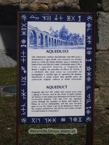 O aqueduto contava inicialmente com 999 arcos, cuja envergadura vai aumentando à medida que se aproxima do destino, e transportava a água desde uma nascente em Terroso, junto ao nicho de Stº António, para o Mosteiro de Stª Clara, em Vila do Conde. Foi construído entre 1705 e 1714 e atravessa as freguesias de Beiriz e Argivai, no concelho da Póvoa de Varzim.
