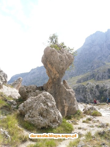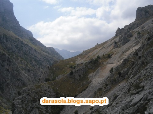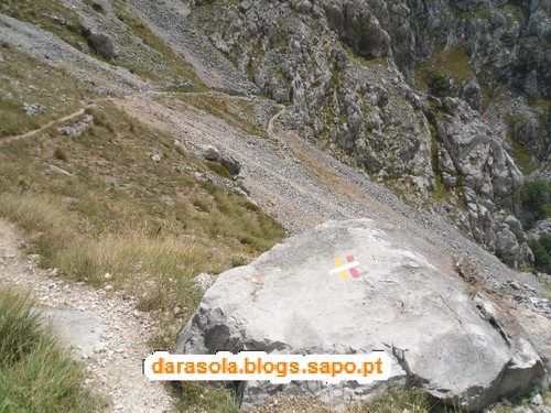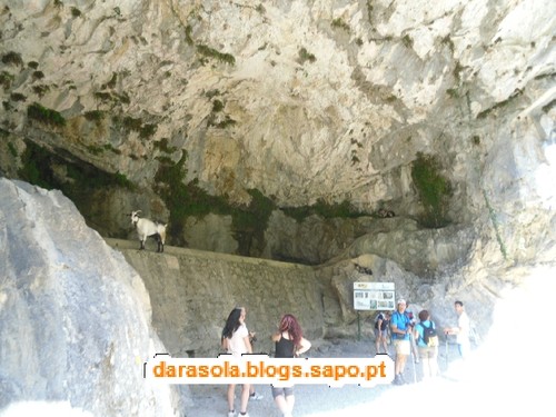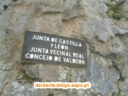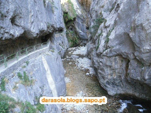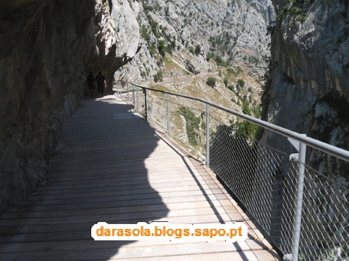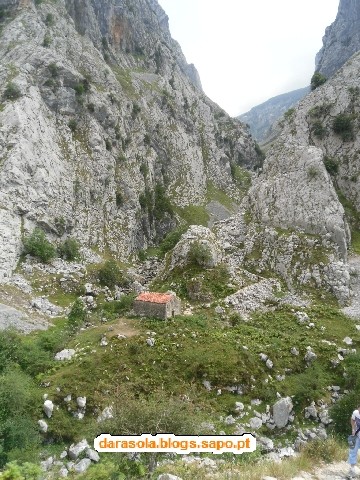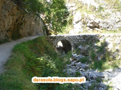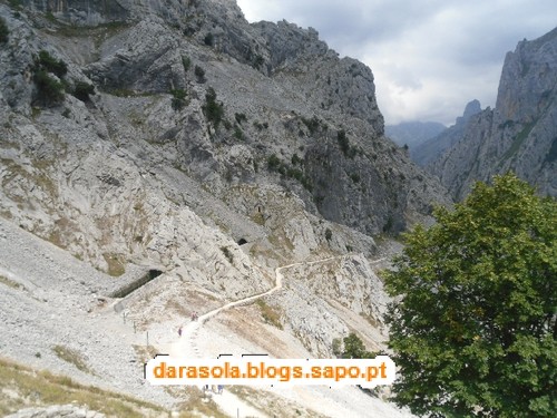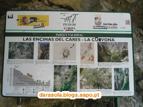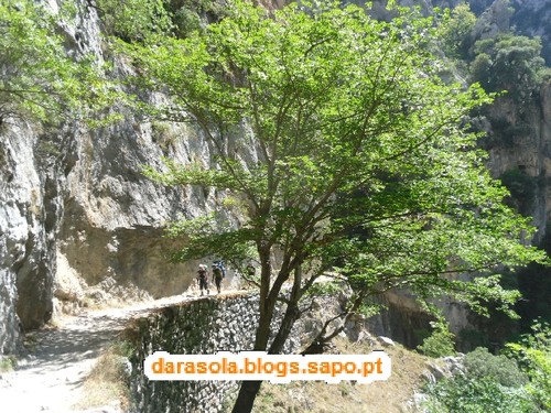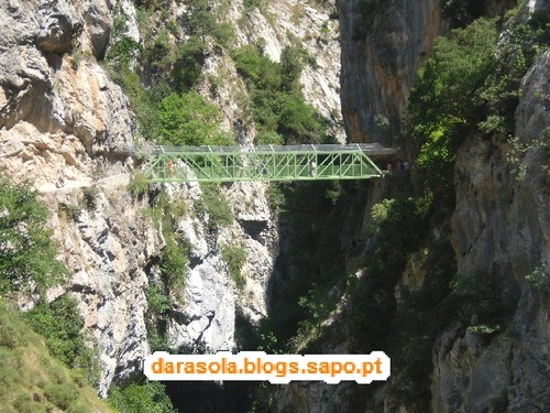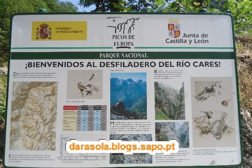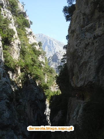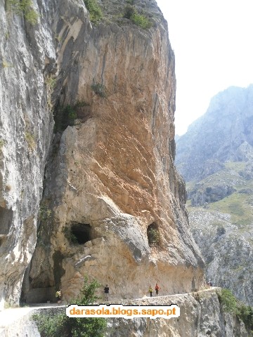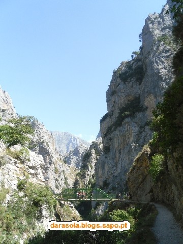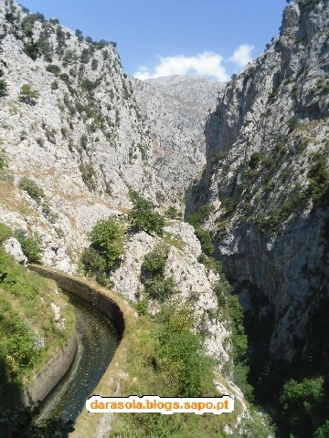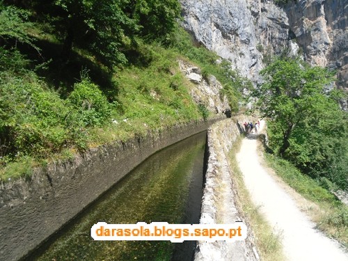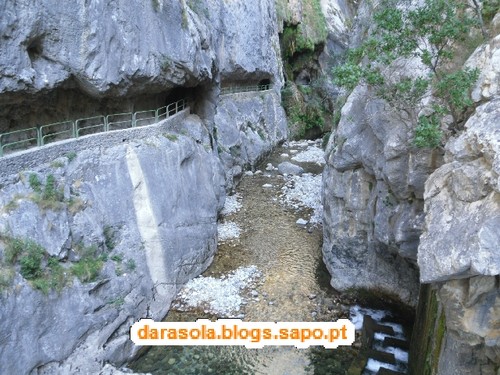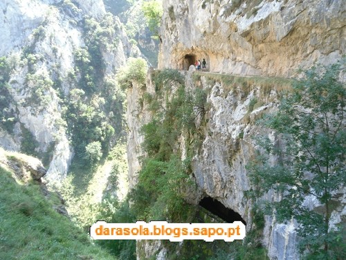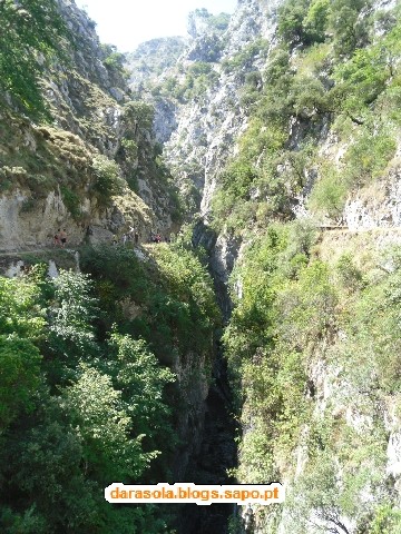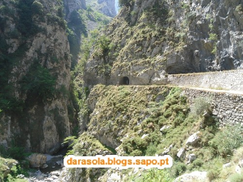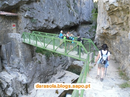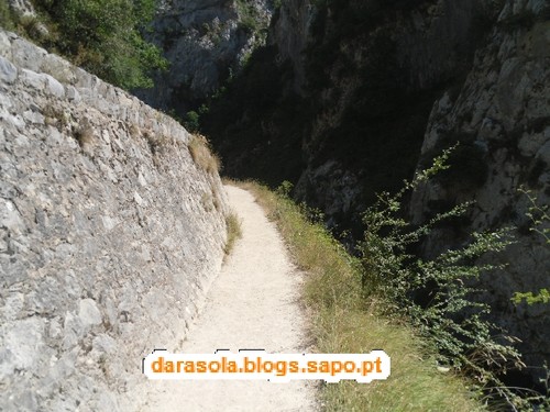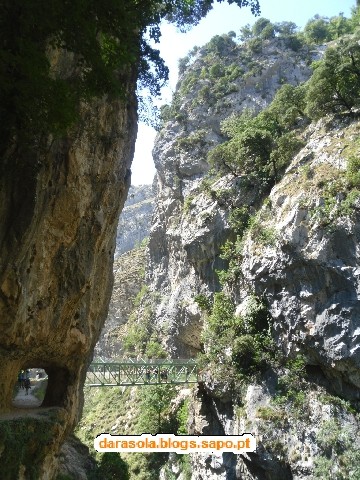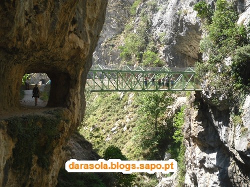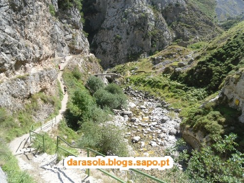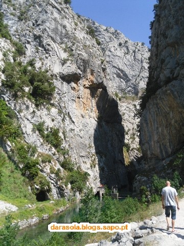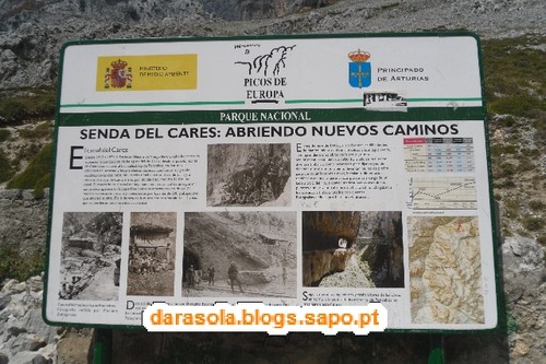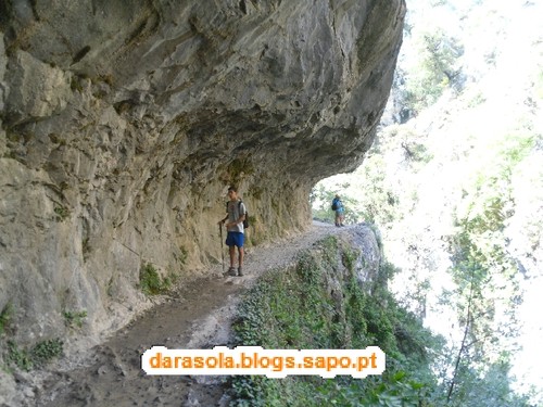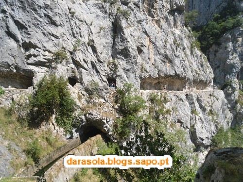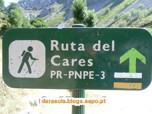Praticamente desde que comecei a ouvir falar dos Picos da Europa, percebi que esta era A CAMINHADA imperdível. As expectativas era altas e posso confirmar que não ficamos nada desiludidos. O percurso de cerca de 12 km segue pelo desfiladeiro do rio Cares, que serpenteia entre paredes verticais de centenas de metros de altitude. Nalguns locais, a largura do desfiladeiro tem pouco mais de 3 metros de largura. Quase parece que podemos tocar o outro lado. Ao longo do percurso, atravessámos pontes metálicas que impressionam, não só pela altura, mas também por pensarmos como é que foram construídas naquele local onde nenhum veículo consegue chegar. Também conhecida como "Garganta divina", esta rota tem a particularidade de proporcionar a qualquer pessoa sem grande experiência em pedestrianismo o acesso a paisagens deslumbrantes! O percurso inclui a travessia de algumas grutas escavadas na rocha calcária dos maciços, por forma a permitir a progressão e passagem dos operários que construíram o canal que existe ao longo do todo o percurso e que levava a água captada em Cain até Poncebos, onde existia uma antiga unidade energética. Pelo caminho percebemos que era mesmo um trilho turístico, tal era a quantidade de pessoas que encontramos por lá, certamente mais de duas centenas espalhadas ao longo do trilho (as informações oficiais dão conta de 200 000 visitantes por ano). Apesar disso, a caminhada não perde a piada, pois o trilho é perfeitamente seguro (praticamente 1,5 de largura em todo o percurso), embora tenha reparado que muitas pessoas com quem me cruzavam optavam por circular sempre encostadas à parede. Para quem quiser conhecer, há que lembrar que é uma rota de montanha com precipícios perigosos e nada aconselhável a quem possa ter vertigens. Para além disso, há sempre perigos presentes, como o risco de queda de rochedos, podendo ferir gravemente os caminheiros, como aconteceu em Setembro passado. Há que recordar também que no início do presente ano (2012), ocorreu uma derrocada que levou parte do caminho. Felizmente, o governo local tratou de reparar o percurso com a colocação de um passadiço seguro para a travessia. A ruta del Cares, por ser um percurso ao longo de um desfiladeiro, é um percurso exposto e por vezes sufocante, pelo que é necessário levar líquidos q.b.